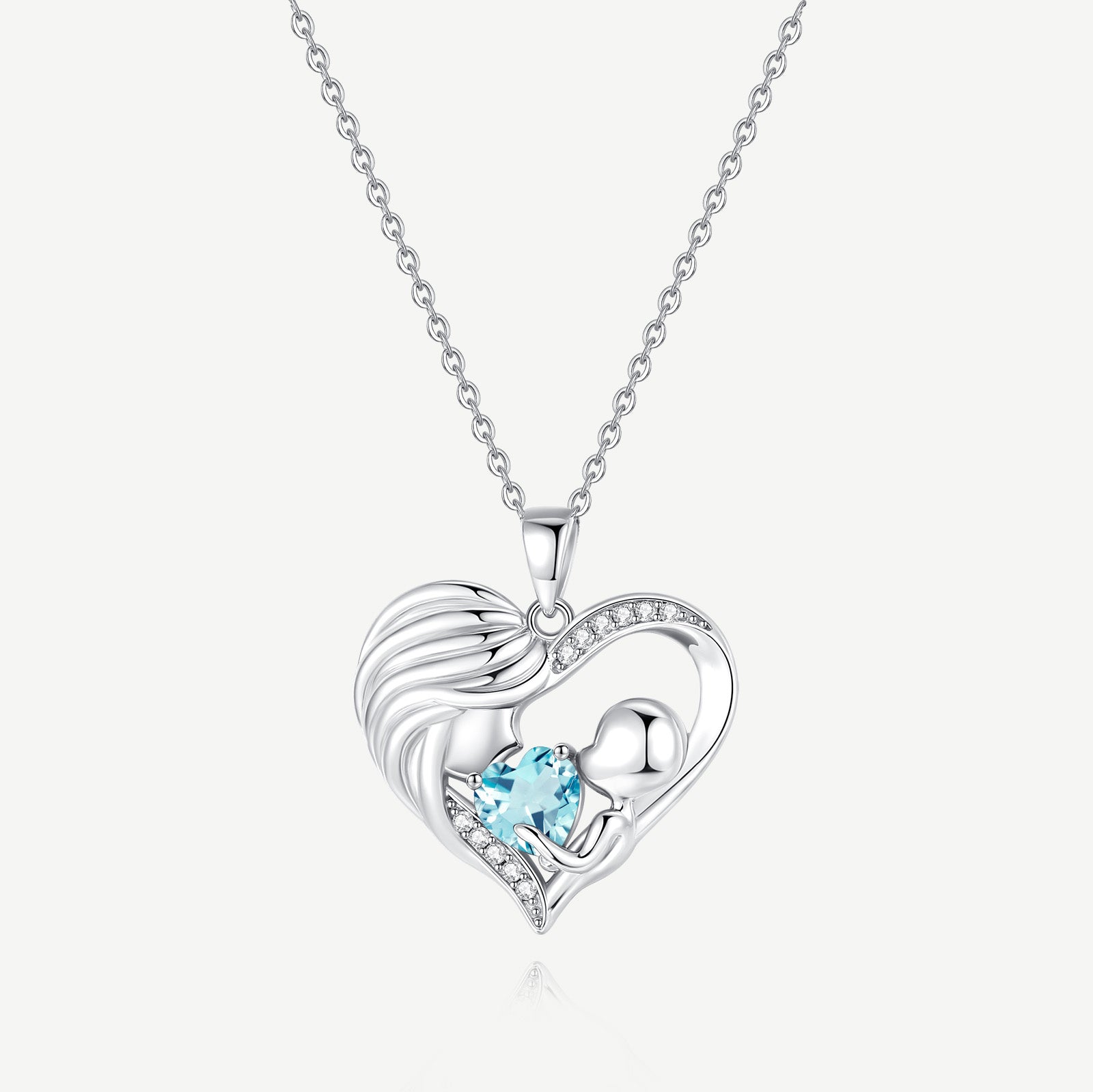 Mother and Child Love Heart Necklace in Sterling Silver with Aquamarine