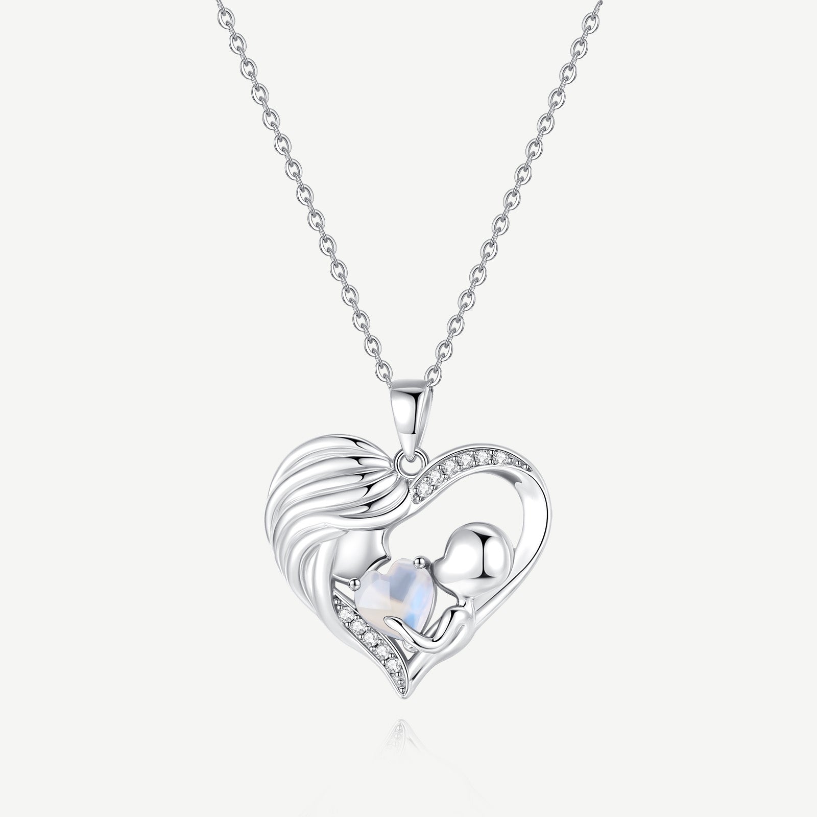 Mother and Child Love Heart Necklace in Sterling Silver with Moonstone